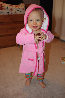 Reese was rocking a robe with leggings today after her bath, while waiting for her clothes to finish drying in the dryer.